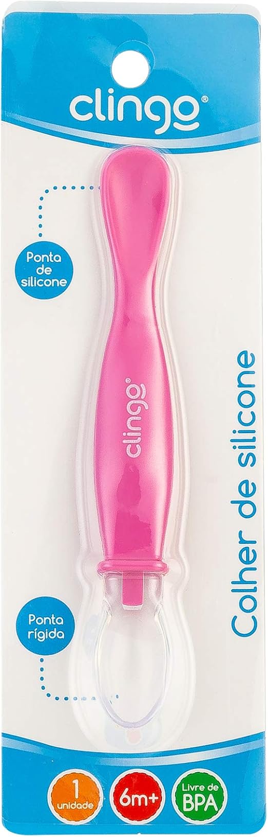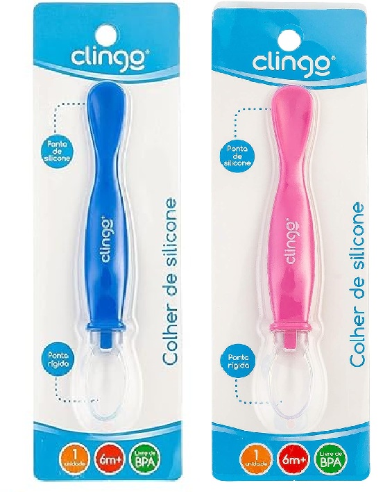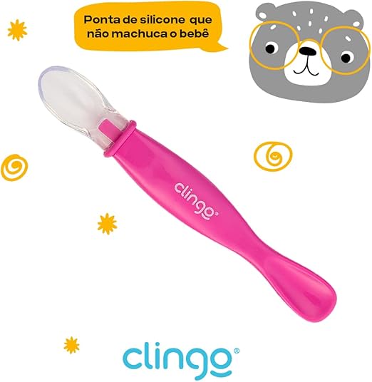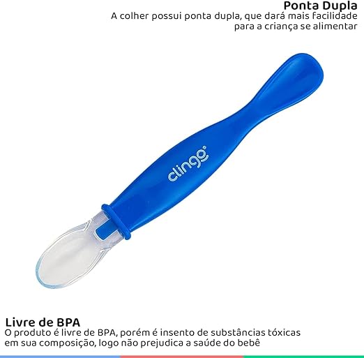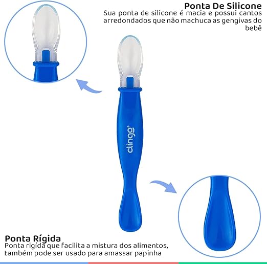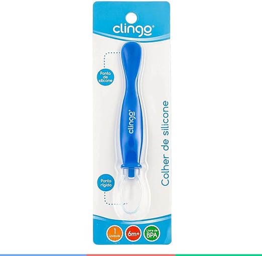 A Colher de silicone CLINGO possui ponta dupla. Uma ponta macia de silicone e outra rígida. Ideal na transição da criança para uma alimentação sólida. Sua ponta dupla é perfeita para raspar a frutinha com a ponta rígida e servir para o bebê com a ponta macia.