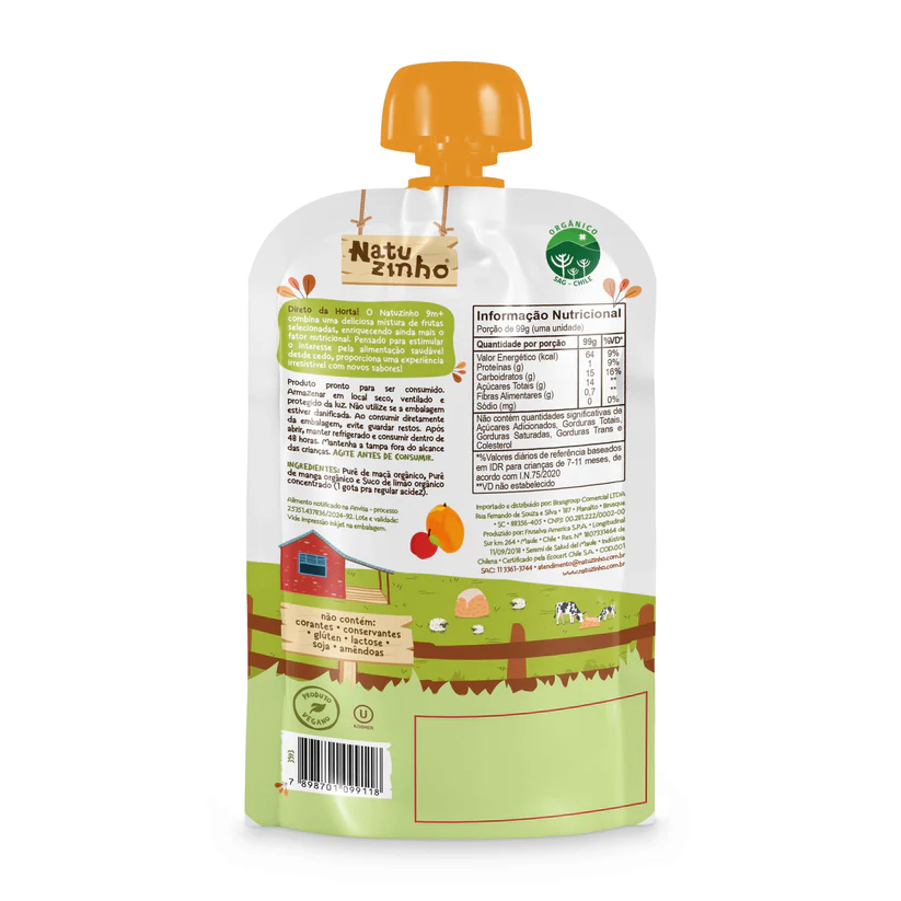 Ingredientes: Purê de Manga Organico, Purê de Maçã Orgânico e Suco de Limão Orgânico Concentrado (uma gota, pra regular a acidez)