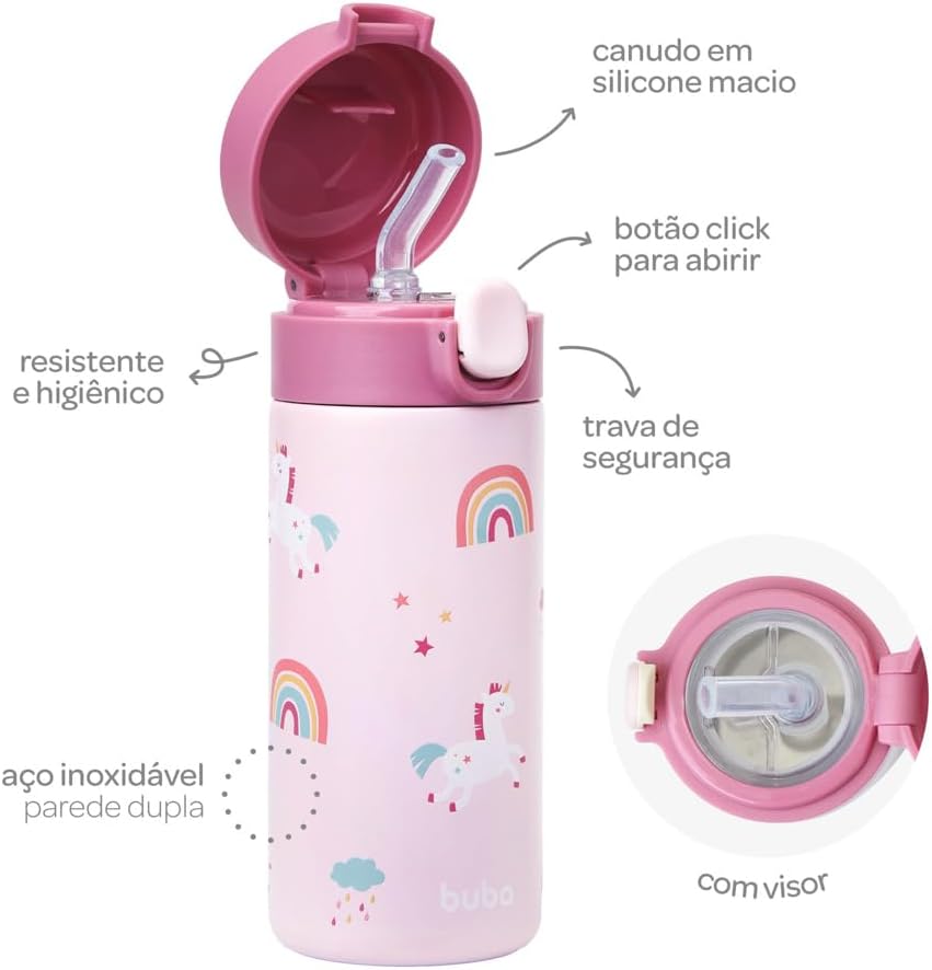 Além de resistente e higiênico, conta com canudo de silicone, trava de segurança, válvula antivazamento, tampa rosqueável e abertura por botão, que facilitam o uso pelas crianças e ajudam a prevenir vazamentos.