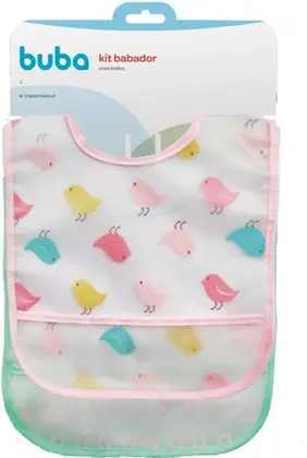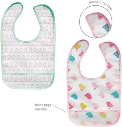 O Babador com Pega Migalhas Passarinho da Buba possui tecido impermeável e bolso pega migalhas, ideal para evitar que o pequeno suje a roupinha. O fecho se ajusta facilmente ao pescoço do bebê.