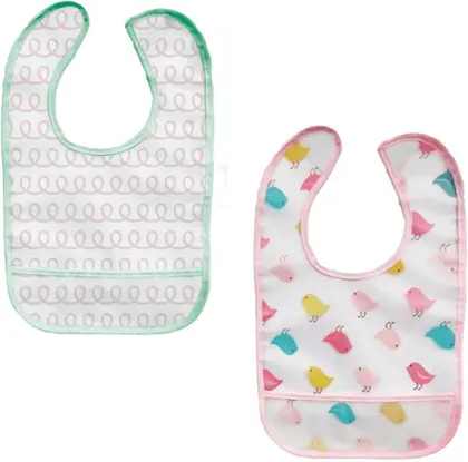 Babador impermeável Buba com bolso pega migalhas e fechamento de tiras autocolantes é prático, confortável e durável que se ajusta ao pescoço do bebê. Fácil de limpar e resistente a maioria das manchas. Ideal para proteger a roupinha do bebê durante as refeições.