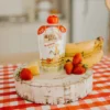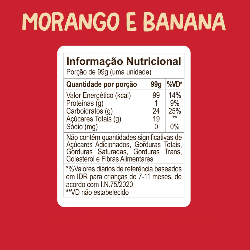 Ingredientes: Purê de Banana Orgânico, Purê de Morango Orgânico e Suco de Limão Orgânico Concentrado (uma gota, pra regular a acidez)